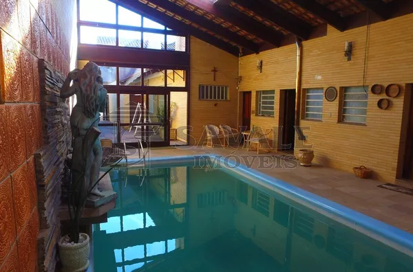 Área com piscina coberta e churrasqueira, garagem para 02 carros e sótão com sala de estar;