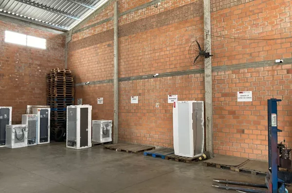Pavilhão com a área de 315,00m², (15,00X21,00m), 6,5m de pé direito; telhas em aluzinco, calhas de chuva em alumínio, janelas basculantes em policarbonato piso polido com 18,00cm com malha de aço, preparado para suportar carga pesada, portão com 05,00m de largura de contrapeso com movimentador eletrônico, com sistema de câmera com monitoramento Intelbrás com DVR;