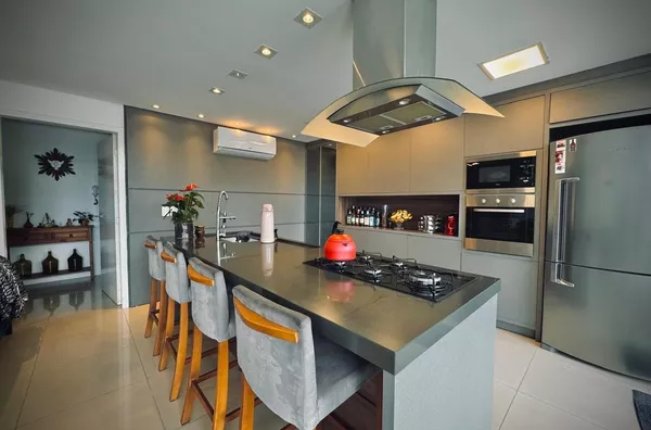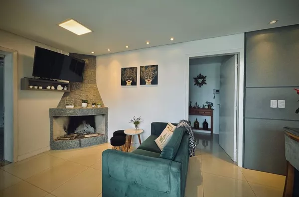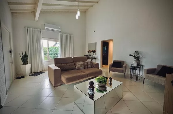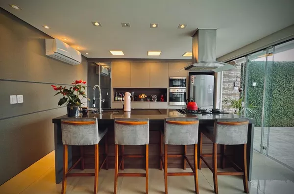 No andar inferior dispõe de sala de TV com lareira, cozinha, sala de jantar e lavabo em conceito aberto formando um amplo ambiente com vista panorâmica para o jardim que dispõe de piscina e deck com belíssimo pergolado em madeira. Garagem para 3 carros, churrasqueira, depósito, lavanderia e banheiro auxiliar.