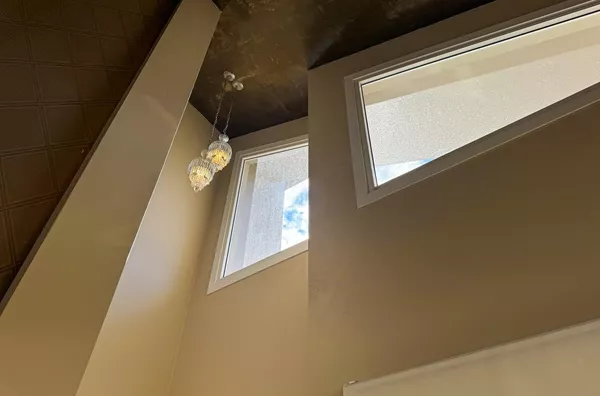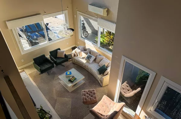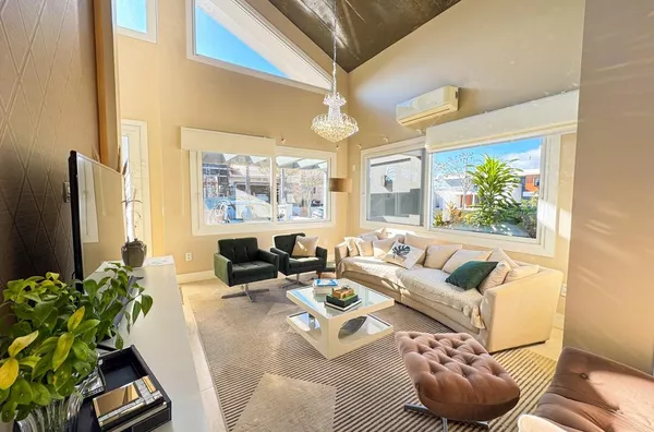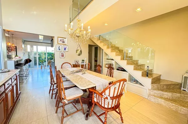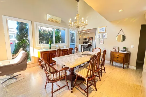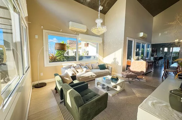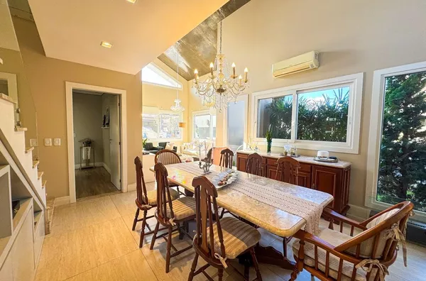 - Ampla sala de estar e jantar integradas com pé direito alto e vários pontos de iluminação natural.