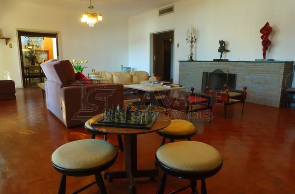 Com 03 dormitórios, 03 banheiros, sendo 01 com banheira de hidromassagem, sala de estar ampla com lareira, sala de TV, 02 salas de jantar, 02 cozinhas, dependência de empregada, escritório;