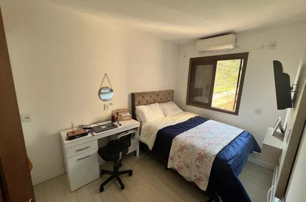 Na parte superior possui 2 dormitórios, sendo 1 suíte, dois banheiros, cozinha com sala de jantar e sala de estar integradas, além de uma ampla sacada.