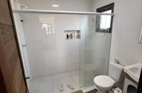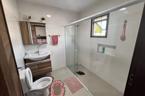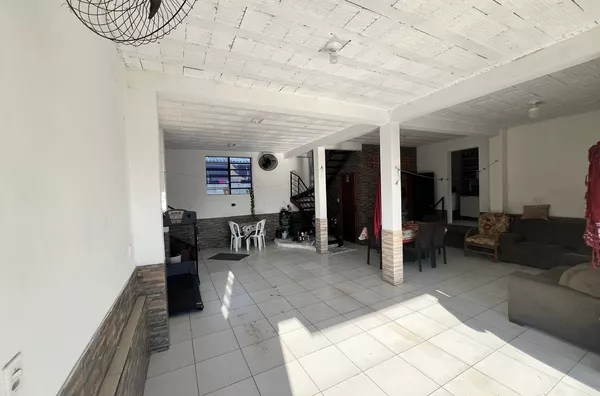 Na parte inferior possui amplo espaço com garagem, salão de festas, cozinha com churrasqueira, 2 banheiros, lavanderia e despensa.