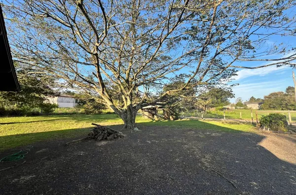 Área toda plana, com árvores frutíferas e muita sombra.